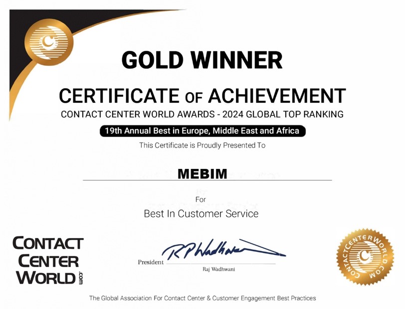 ALTIN MADALYA / EN İYİ MÜŞTERİ HİZMETLERİ / DÜNYA İLETİŞİM MERKEZLERİ ÖDÜLLERİ (AVRUPA, ORTADOĞU VE AFRİKA)