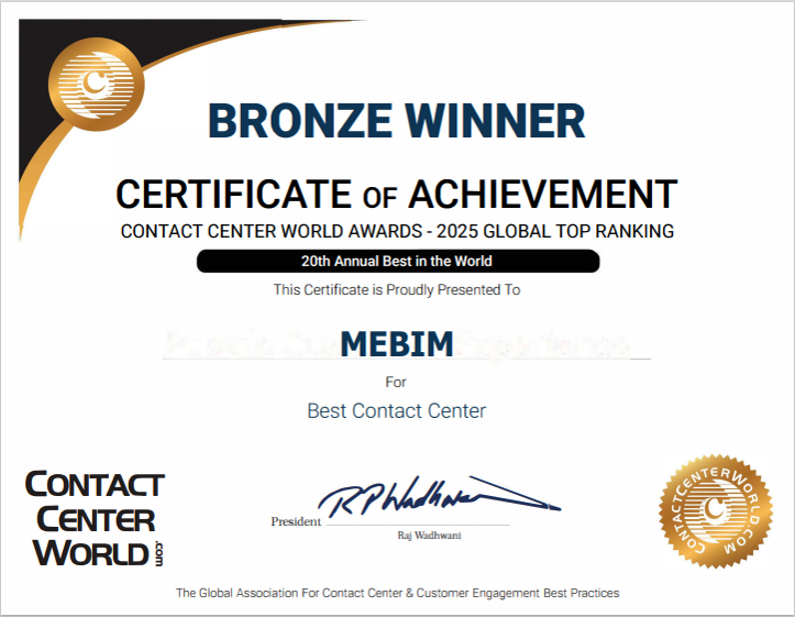 BRONZ MADALYA / EN İYİ İLETİŞİM MERKEZİ / DÜNYA İLETİŞİM MERKEZLERİ ÖDÜLLERİ